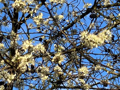 Highlights of March: the blooming of spring - banks of primroses, periwinkles, blossom, violets, anemones and early cuckoo flowers; a cock pheasant gazing motionless at his handsome reflection in the stream; bright red star-like hazel flowers; holes of varying sizes (from bees and water voles to badgers); shield bugs mating back-to-back; a pair of wandering Egyptian geese; dandelion 'clocks' in time for our own clocks to spring forward; news that nightjars in the South Downs National Park have doubled in the past 5 years. More unusual: last seasons' sloes still hanging alongside blossom.