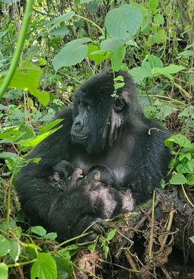 Dedicated community trackers from Virunga National Park observed the event on Saturday 3rd January 2026 and took film of Mafuko hugging her newborns, posting on social media that this first birth of 2026 brings the 'Bageni' family to 59 members, the largest in the Park.