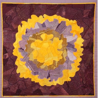 Wind, Sea and Sand, by Sheena Norquay, was inspired by the movement of wind and sea, and the resulting lines and patterns left on the sand, which have amazed the artist for years. The quilting patterns were created by tracing photographs of sand patterns onto acetate, and the curved seam represents where the water meets the sand on a beach in Orkney, the artist's local landscape.