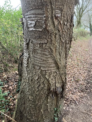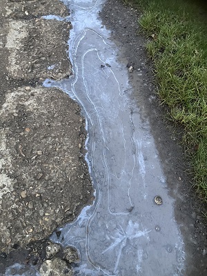Other January Highlights: a cormorant emerging from the base of a small but gushing waterfall, the day after it was clad in a curtain of icicles; the full wolf super-moon; ice crystal paths sparkling in the sunshine; close up sightings of goldcrests in the bare hedgerows; long-tailed tits, goldfinches, bramblings, fieldfares and song thrushes in higher bushes and trees; the infamous black pheasant making an appearance at Theale (perhaps in memory of Gay); freshly dug badger and fox earths after the floods; a heron 'sunbathing'; mornings of mist slowly burnt away by the rising sun; the varied patterns, textures and hues of tree bark; finding familiar outlines - a penguin and Mary, Mother of God, in the swirls of an ice puddle!