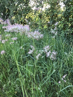I even love their names! In some fields, the sprouting dark pinky-purple spikes of head high thistles hold a commanding view over Meadow Foxtail grasses, Tufted vetch, clumps of Yorkshire fog flowers, Cocksfoot, Timothy and Creeping and Common Bent grasses, Purple Loose Strife, Yellow Toadflax and one of my favourites, the striking bluish violet flowers of Meadow Crane's Bill that attract a wide variety of bees. But the thistles are nothing in size compared to the 2metre tall red tinged flower clusters of Wild Angelica running alongside our streams, or the really giant Hogweed that towers over everything, whilst gentle, peace-loving water forget-me-not blooms wend their way up their shins and demoiselles and broad-bodied chaser dragon-flies hover nearby. Much further down below, in patches where the sunlight meets the soil such as paths and field margins, the delicate low-growing flowers of common milkwort and yellow flowered Tormentil (like buttercups but with only 4 petals), join purple and white clover, delicate pink bindweed trumpets and small clusters of the dawn and dusk coloured slippers of bird's foot trefoil - all enticing insects galore.