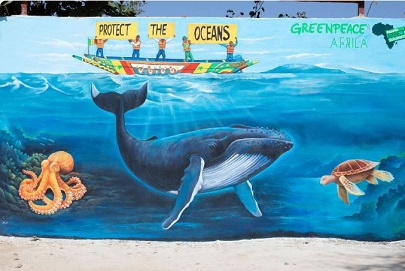 (Photo Credits: Leonard on seas pics © Laura Lewis / Greenpeace, Ocean Themed Mural in Dakar, Senegal © Ma Ibra Laye / Greenpeace, Menu pic Mural for Ocean Protection © Greenpeace / Caleb Mbuvi).