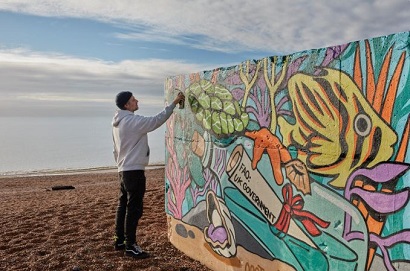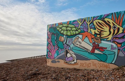 In the UK, a colourful new artwork, twice the length of a double decker bus, was painted on Leonard-on Sea's town's beachside Bathing Hut Cafe. The mural, by Bristol-based artist, Richt, features a message in a bottle addressed to the UK government which has sunk to the ocean floor, visible among a host of beautiful ocean creatures including a turtle, an angelfish and an oyster.