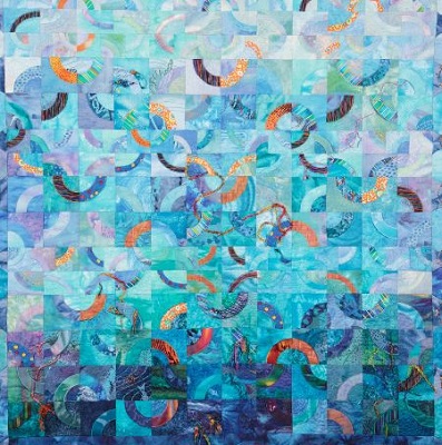 Wind, Sea and Sand, by Sheena Norquay, was inspired by the movement of wind and sea, and the resulting lines and patterns left on the sand, which have amazed the artist for years. The quilting patterns were created by tracing photographs of sand patterns onto acetate, and the curved seam represents where the water meets the sand on a beach in Orkney, the artist's local landscape.
