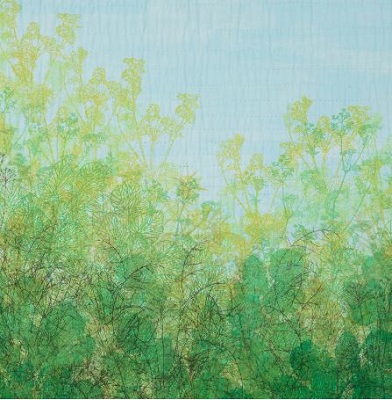 Works by quilt artist Pauline Burbidge are often inspired by the landscape around her home in the Scottish Borders, and Honesty Skyline is no exception. Made using cyanotype printing and fabric rubbings, the imagery features Honesty (Lunaria annua), a plant best known for its translucent circular seed pods, and red hot poker leaves.