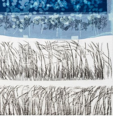 'Suffolk Marshes, by textile artist Jo Budd, belongs to a series of works created by the artist in response to the landscape immediately surrounding her studio, and more specifically to the water meadow at the bottom of her garden, which regularly floods each year. Water and its effects - ripple, reflection, and transparency - are themes that fascinate the artist and feature in many of her works.